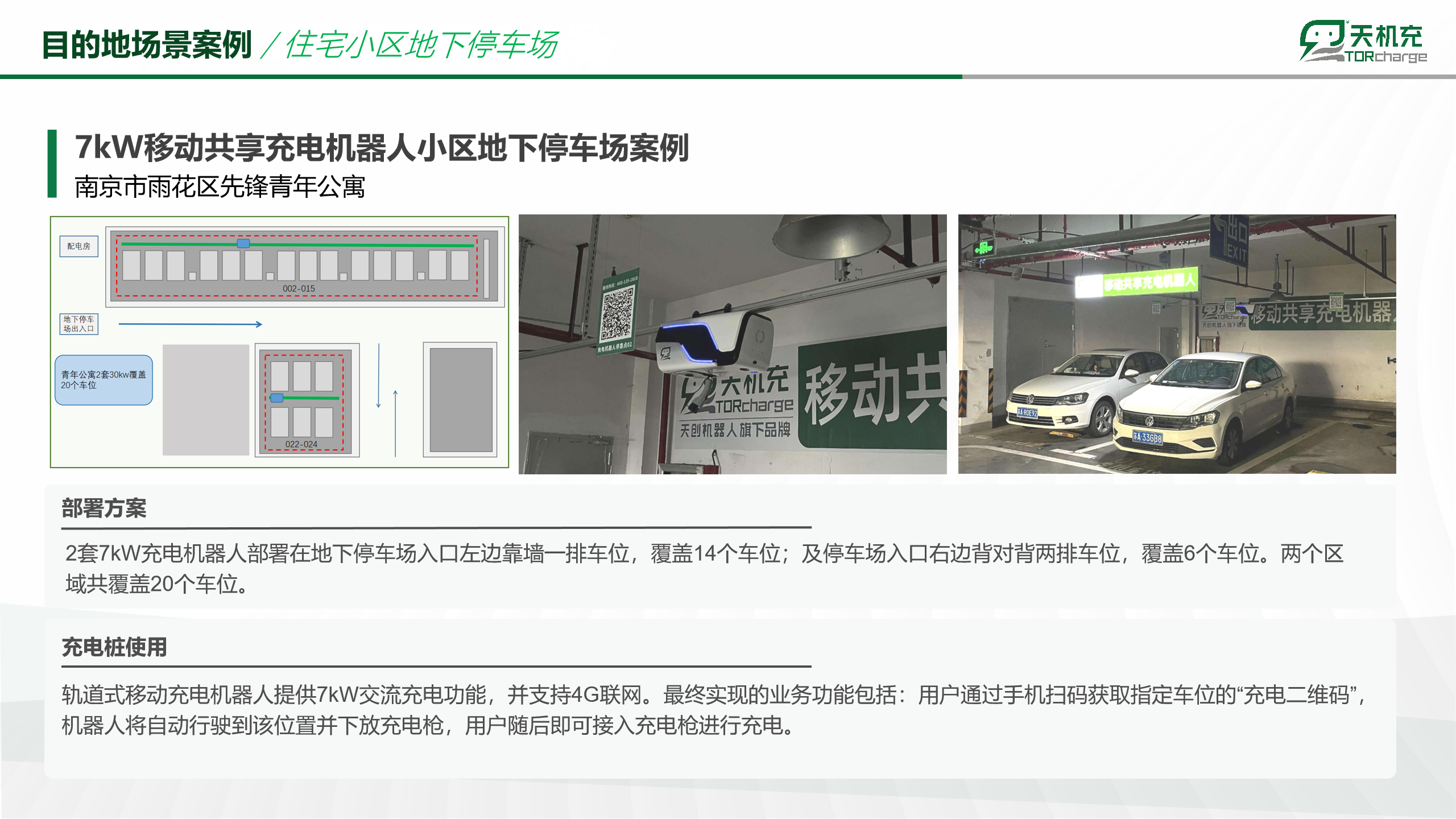 移动轨电机器人充电解决方案 通过在车库顶部部署轨道系统,结合机器人控制技术和物联网技术,为电动汽车提供方便、高效的充电服务。与传统的“车找桩”模式相比,移动轨道充电机器人实现了“桩找车”,大幅提高了充电桩的利用效率,解决了充电桩一“桩”难求的问题。该系统通过共享充电模式,减少了充电设施的投资成本,同时根据车辆情况灵活增减,以满足充电需求。